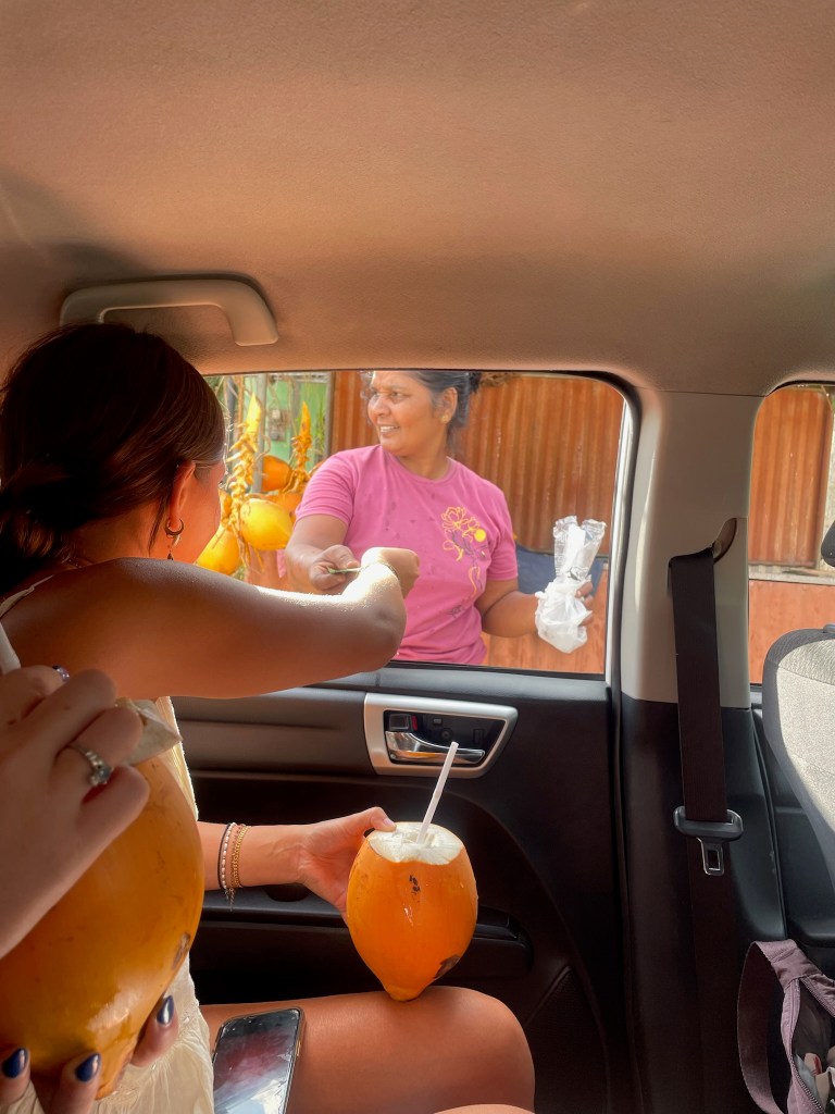 We took an Uber from Colombo to Sigiriya (there are far cheaper ways such as public transport to get from place to place but we were on limited time and sleep). The journey took just over 4 hours, driving through beautiful forest areas. I couldn’t praise our driver enough. He was so accommodating and would often pull over to get us to try a new fruit. See below the refreshing coconuts he bought for us! He taught us how to use the lid of the coconut as a spoon to get all the meat out once we had drank the liquid! The coconuts were a bright orange colour on the outside and super sweet & refreshing to drink.
