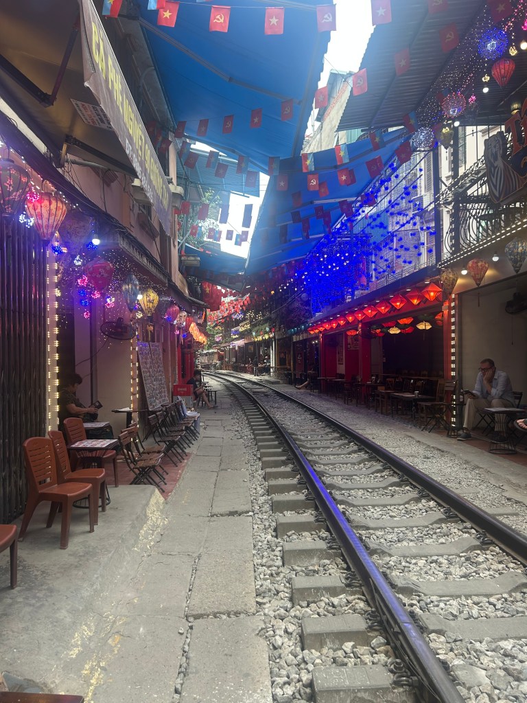 Of course when you are in Hanoi, you have to visit the famous Train Street. I entered the train street from 222 le Duan Lane Hanoi. It seemed to be a lot less busy than the famous spot. We easily got a seat outside a cafe. The vendors weren’t pushy about us buying stuff from them, but we each got coconuts anyways to support them. We watched maybe three trains go by in the ½ an hour we spent there. It is crazy how close they get to you! People would place bottle caps under the wheel to take home as a souvenir.