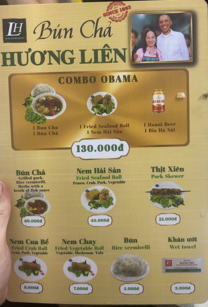 The one restaurant you have to go to, even just for the experience is Bún Chả Hương Liên located in Hanois Old quarters. It is renowned for having Barck O’Bama and Anthony Bourdain eat here in 2016. The restaurant has made its whole theme all about this visit from the menu design, to pictures around the restaurant to even a glass enclosed table and chairs where Barack O’Bama sat and ate his food. The menu is limited to about 6 options.