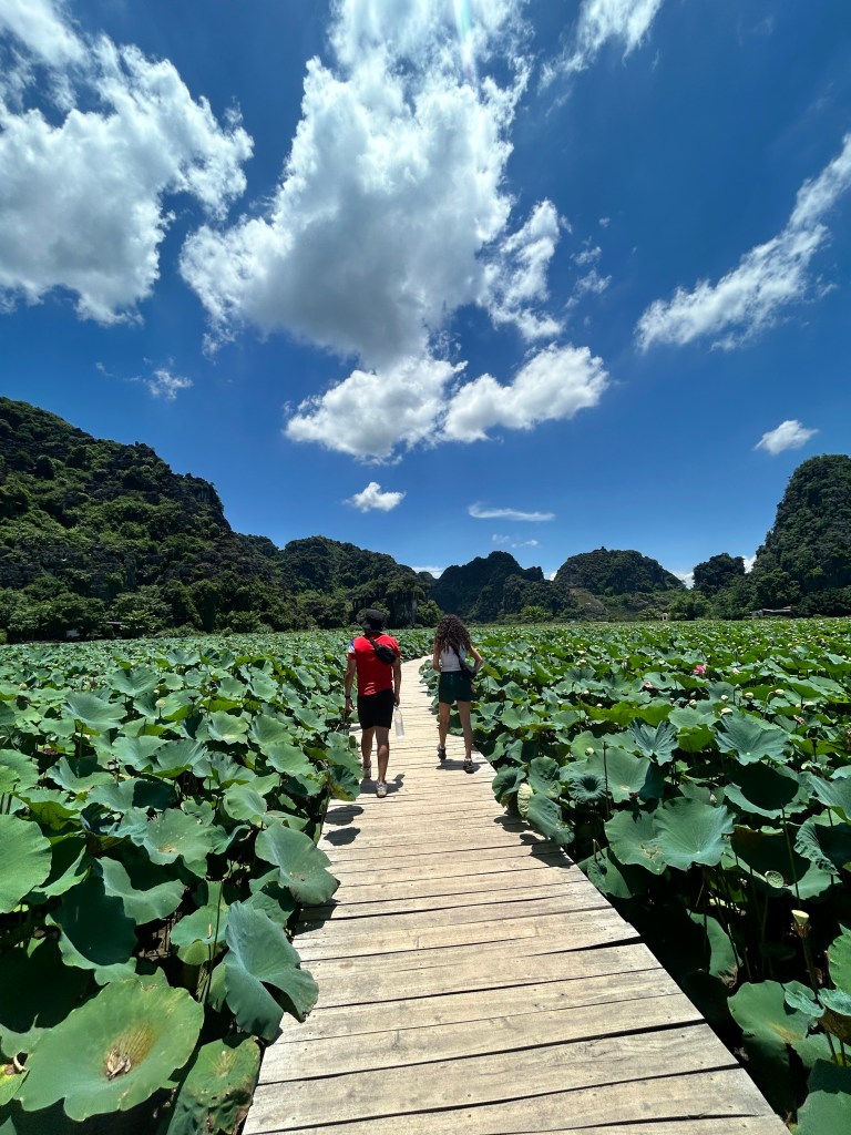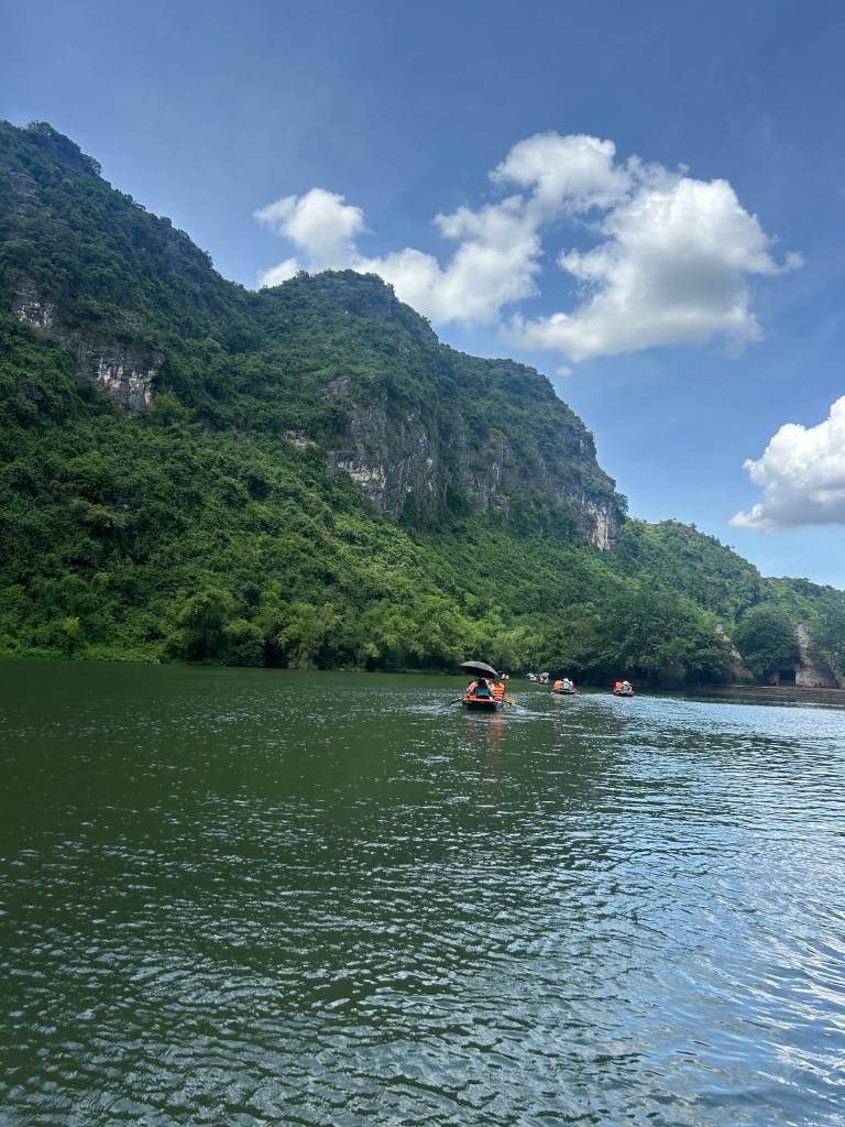 Ninh Binh is also famous for its Trang An boat tours– a unique world heritage site through a variety of limestone karsts. Women and men will expertly row you in their small paddle boats with their bare feet down the river. We opted for the tour that would take you through a long limestone cave where you have about a foot of headspace before it opens into a tall cave space. You may spot some bats flying around as well. This tour will also stop off at some temples along the river front!